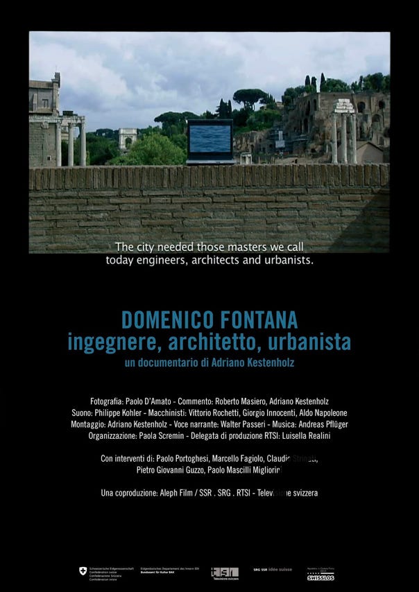La Villa Montalto sul colle dell’Esquilino (demolita alla fine dell’ottocento per la costruzione della stazione Termini); la Cappella Sistina di Santa Maria Maggiore; la Condotta dell’Acqua Felice; l’erezione dell’Obelisco vaticano e i restauri delle Colonne Antonina e Traiana; il Piano urbanistico di Papa Sisto Quinto e l’incrocio delle Quattro Fontane; il Complesso del Laterano con la Loggia delle Benedizioni e l’edificio della Scala Santa; il Palazzo del Vaticano e la Biblioteca pontificia; il Progetto di ristrutturazione del Colosseo; la Condotta idrica di Torre Annunziata (durante i cui scavi sono venuti per la prima volta alla luce i resti di Pompei) e il Palazzo Reale di Napoli sono le opere e le imprese di Domenico Fontana indagate dal documentario e commentate attraverso un’inedita soluzione registica, da Claudio Strinati (Sovrintendente speciale per il Polo Museale di Roma); Marcello Fagiolo (Direttore del Centro di Studi sulla cultura e l’immagine di Roma), Paolo Portoghesi (architetto e studioso del barocco), Pietro Giovanni Guzzo (Sovrintendente agli scavi archeologici di Pompei) e Paolo Mascilli Migliorini (architetto e professore presso l’Università di Napoli).